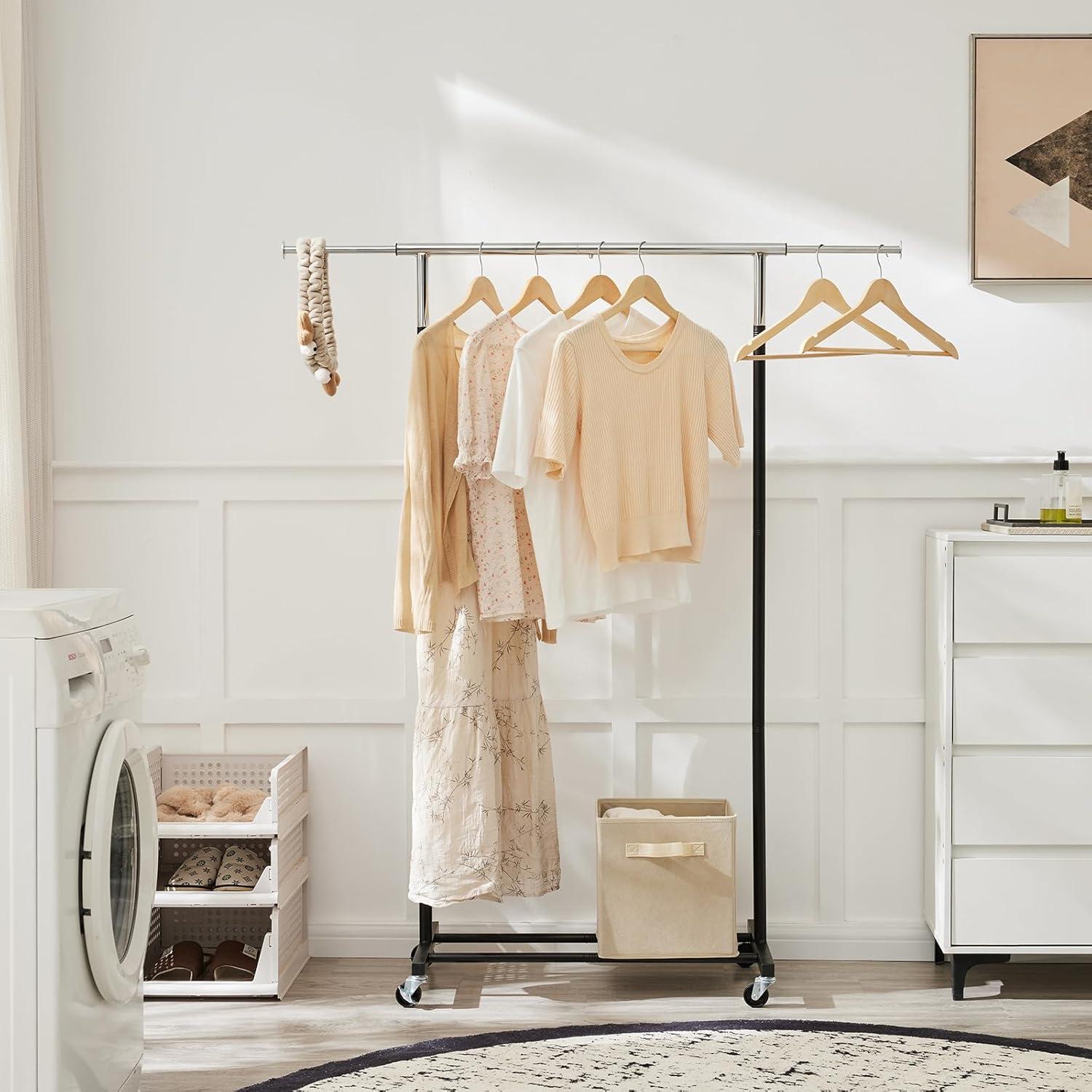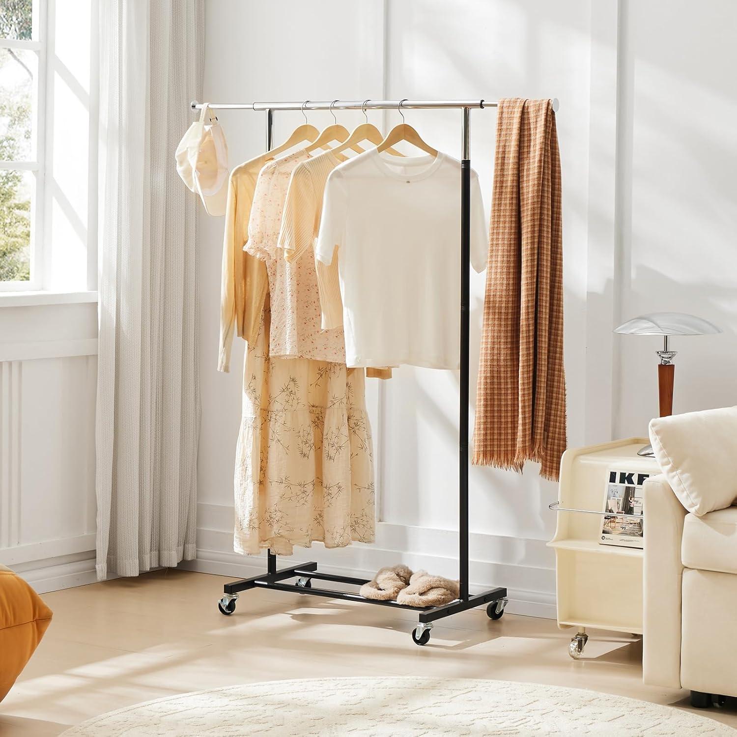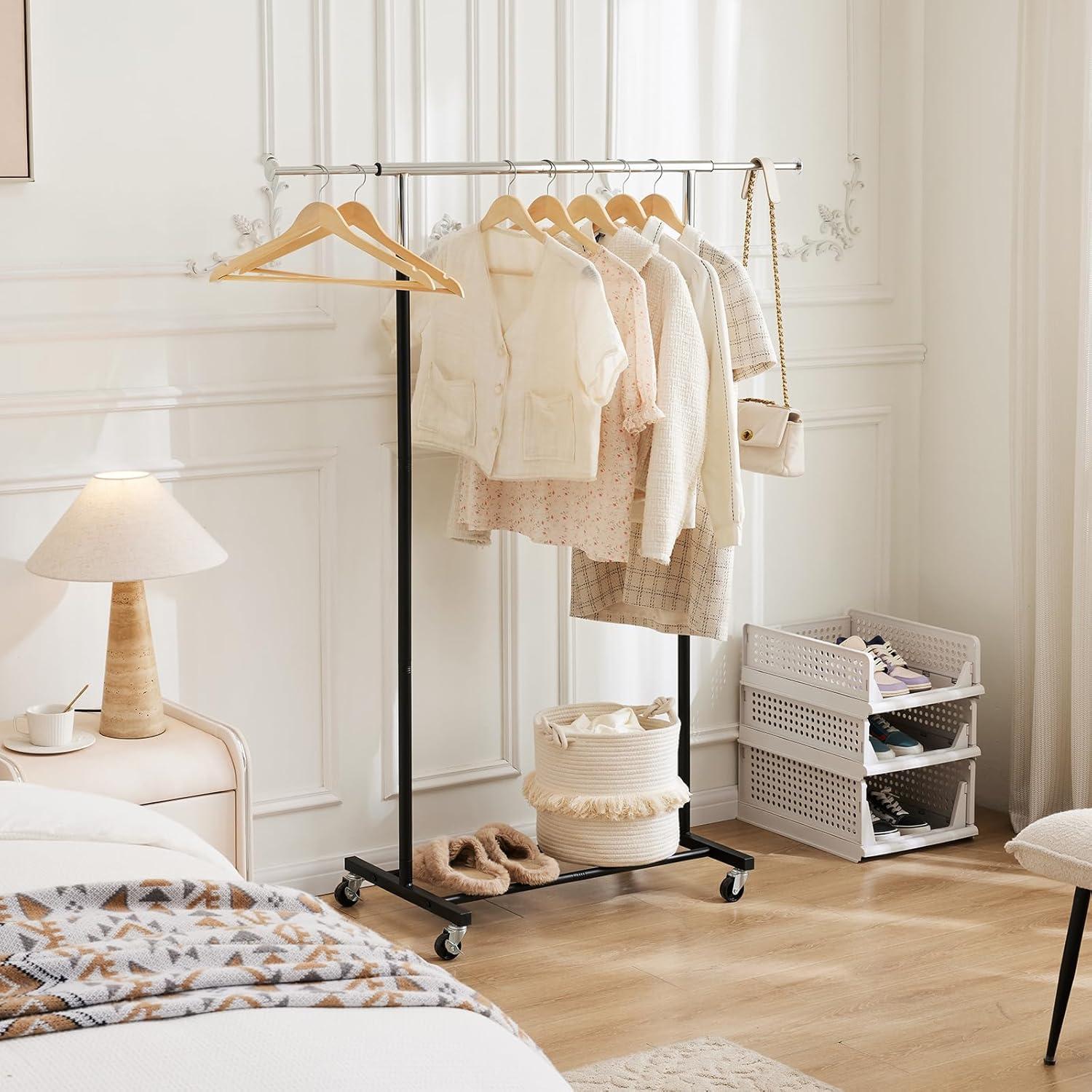 Good Load-Bearing Capacity:The wardrobe rack for hanging clothes with 360-degree swivel wheels ensure that the rolling rack for clothes moves smoothly across any floor. The lockable caster wheels can be fixed to the position as required.