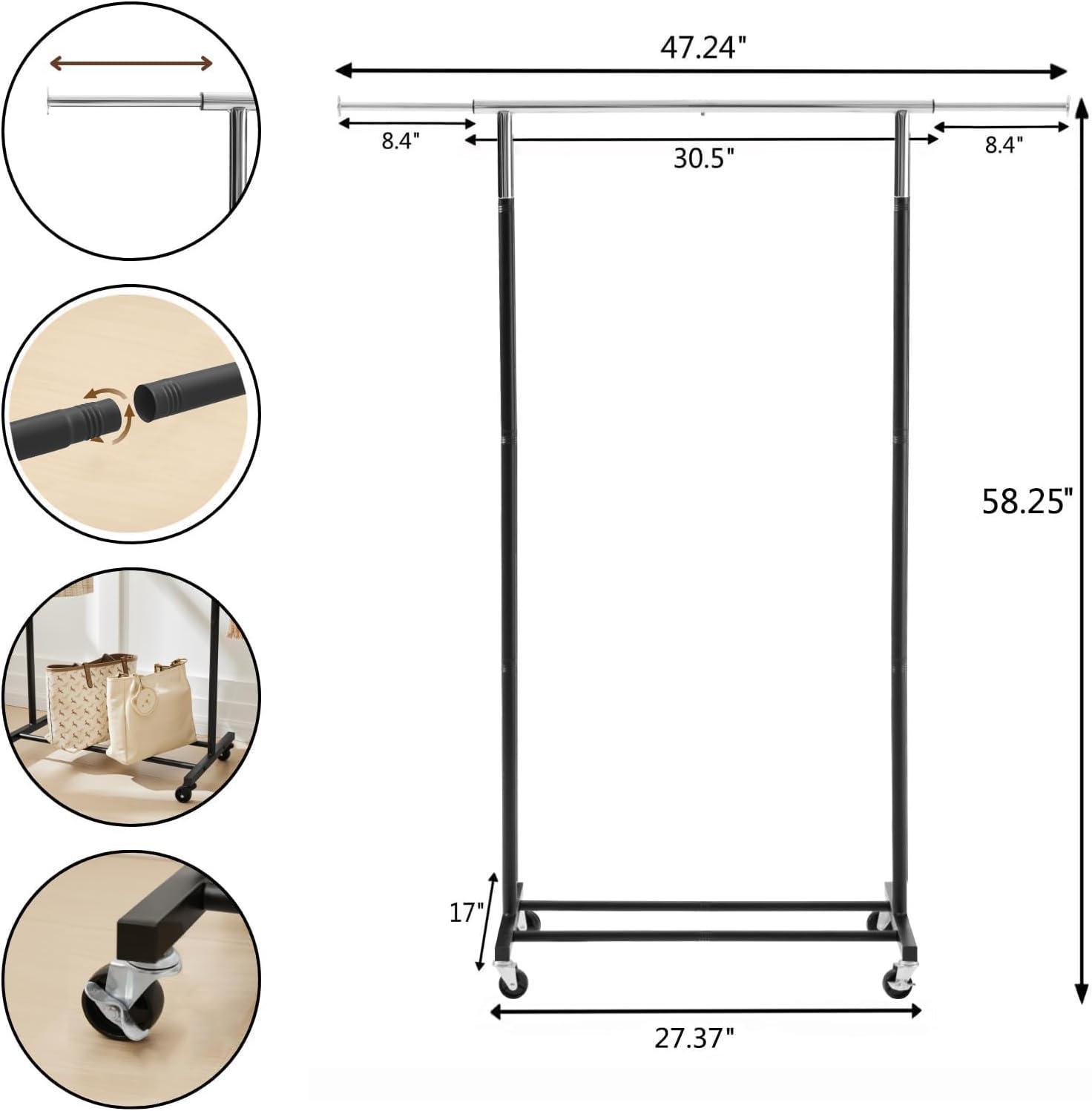 Easy to Assemble:(30.5″-47.2″)L x 17″W x 58″H. Include 2 wrenches and assembly manual for easy assembly. You can assemble and use the clothes rack within 15 minutes. If you have any issues before or after your purchase, please find us via the Amazon Message Center. Your satisfaction is our goal.
